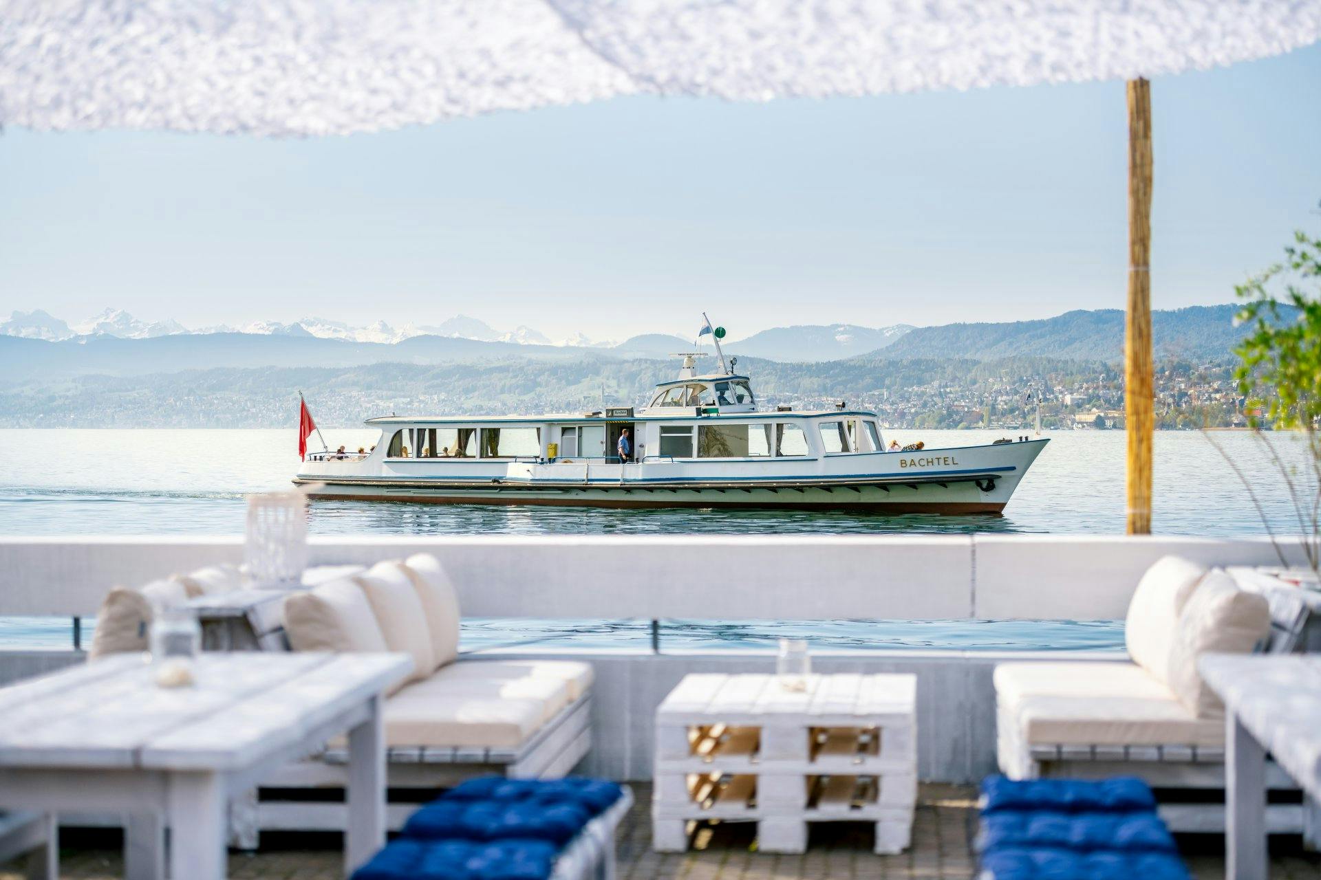 Besonders in den Abendstunden entfaltet sich jene magische Stimmung, die sonst nur von den legendären Sonnenuntergängen an der Westküste Ibizas bekannt ist: Ein Glas Champagner in der Hand, die Füsse beinahe im Wasser, im Hintergrund sanfte Beats – hier verschmelzen Mittelmeer und Alpen zu einem einzigartigen Erlebnis.