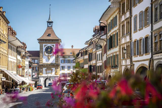 Ein herrlich blau glitzernder See, saftig grüne Wiesen und dazwischen die Ringmauer des mittelalterlichen Städtchens Murten. Es lockt ein gemütlicher Altstadtbummel durch malerische Gassen und Laubengänge, vorbei an historischen Bürgerhäusern und blumengeschmückten Brunnen.