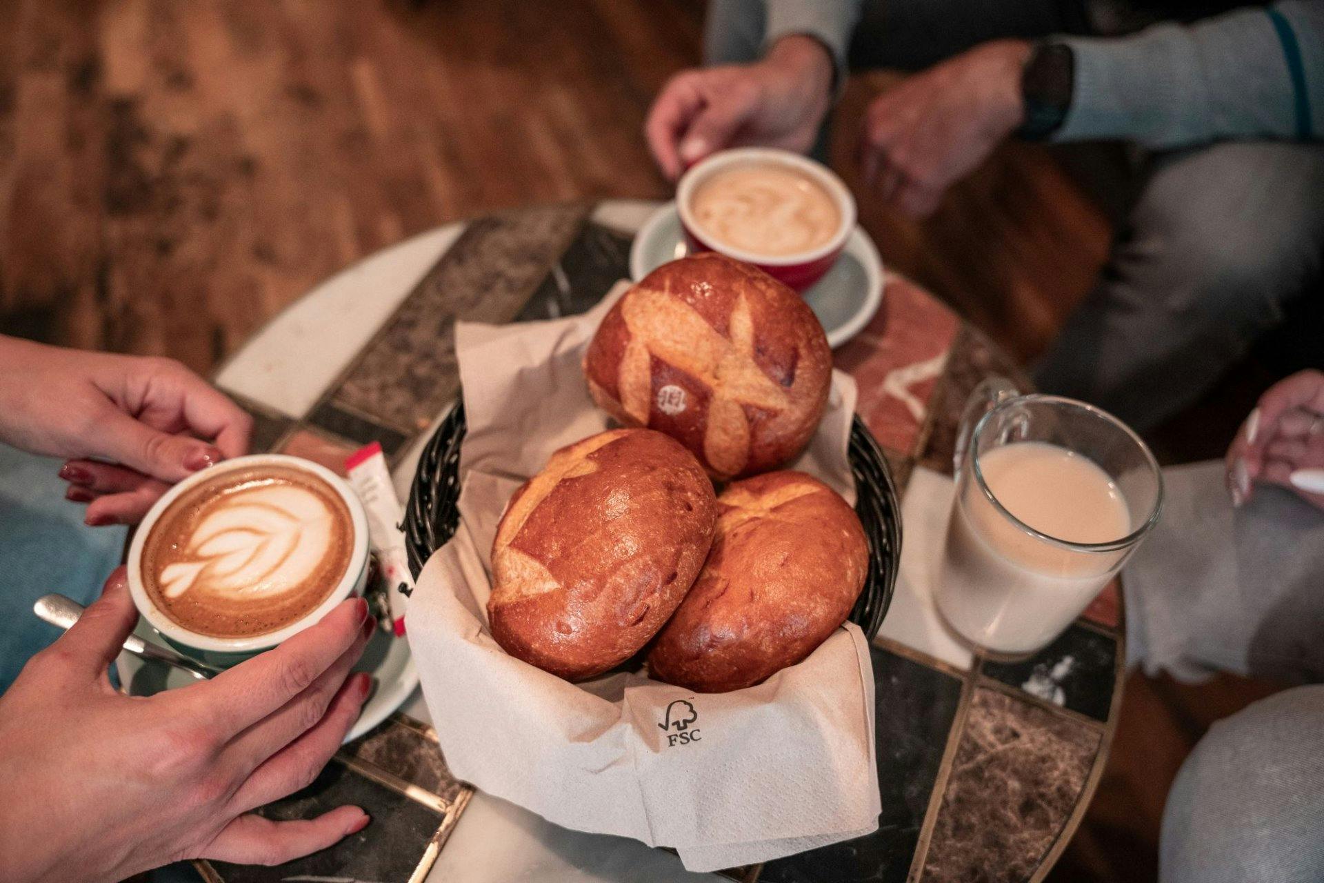 Erster Halt ist das TM Café. Hier warten zur Stärkung ein Heissgetränk und ein traditionelles Brioche-Safranbrot «Cuchaule». Weitere Stopps sind das Restaurant Schweizerhalle, wo es ein Craft-Bier aus Freiburg und eine Apéroplatte mit Käse aus Le Mouret FR gibt.