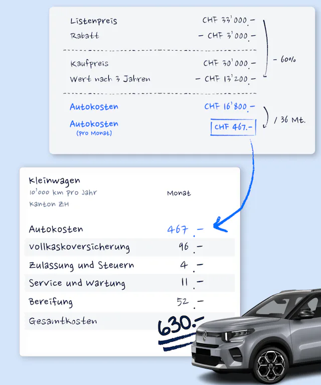 Auf 36 Monate verteilt: 16 800 ÷ 36 = Kosten von 467 Franken pro Monat