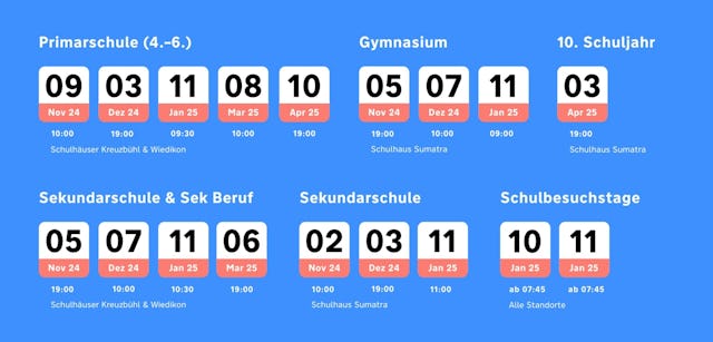 Das Unterrichtsangebot reicht von der 4. Primarschulklasse bis zum Gymnasium. Seit dem Schuljahr 23/24 ist die Sek Beruf im Angebot: Hier werden die Jugendlichen in drei Schuljahren gezielt auf die Lehre und die Anforderungen der Berufsschule vorbereitet – unter anderem durch Trainings für den Stellwerktest.