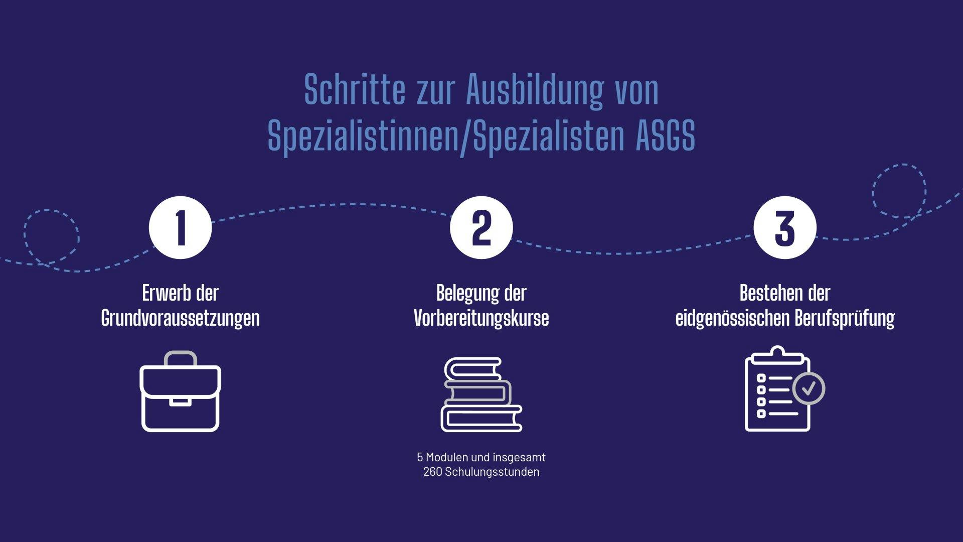 Als Spezialist ASGS gilt es, eine eidgenössische Berufsprüfung zu absolvieren. Die Voraussetzungen für die Prüfungszulassung hängen vom Ausbildungsniveau ab: Kandidaten sollten zwischen drei und fünf Jahren Berufserfahrung mitbringen, davon mindestens ein Jahr im Bereich Gesundheit und Sicherheit am Arbeitsplatz.
